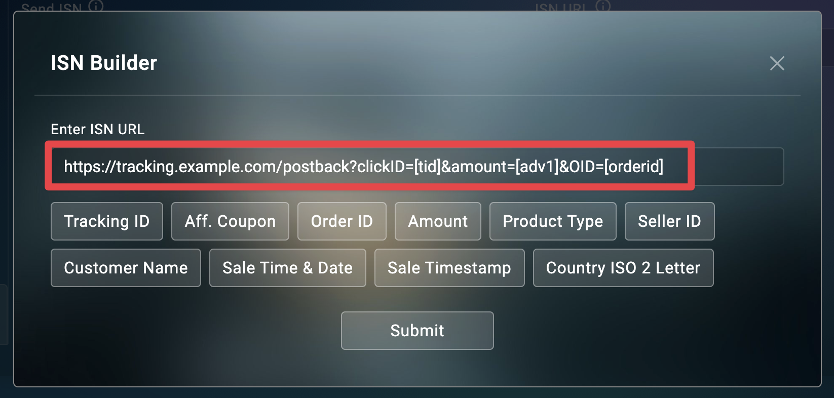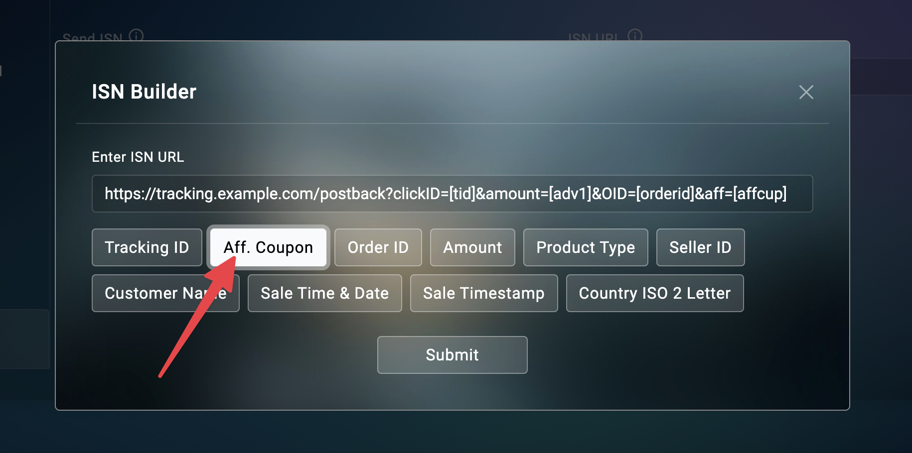 To do this, add the relevant parameter in your Postback URL and select Aff. Coupon in the ISN Builder.